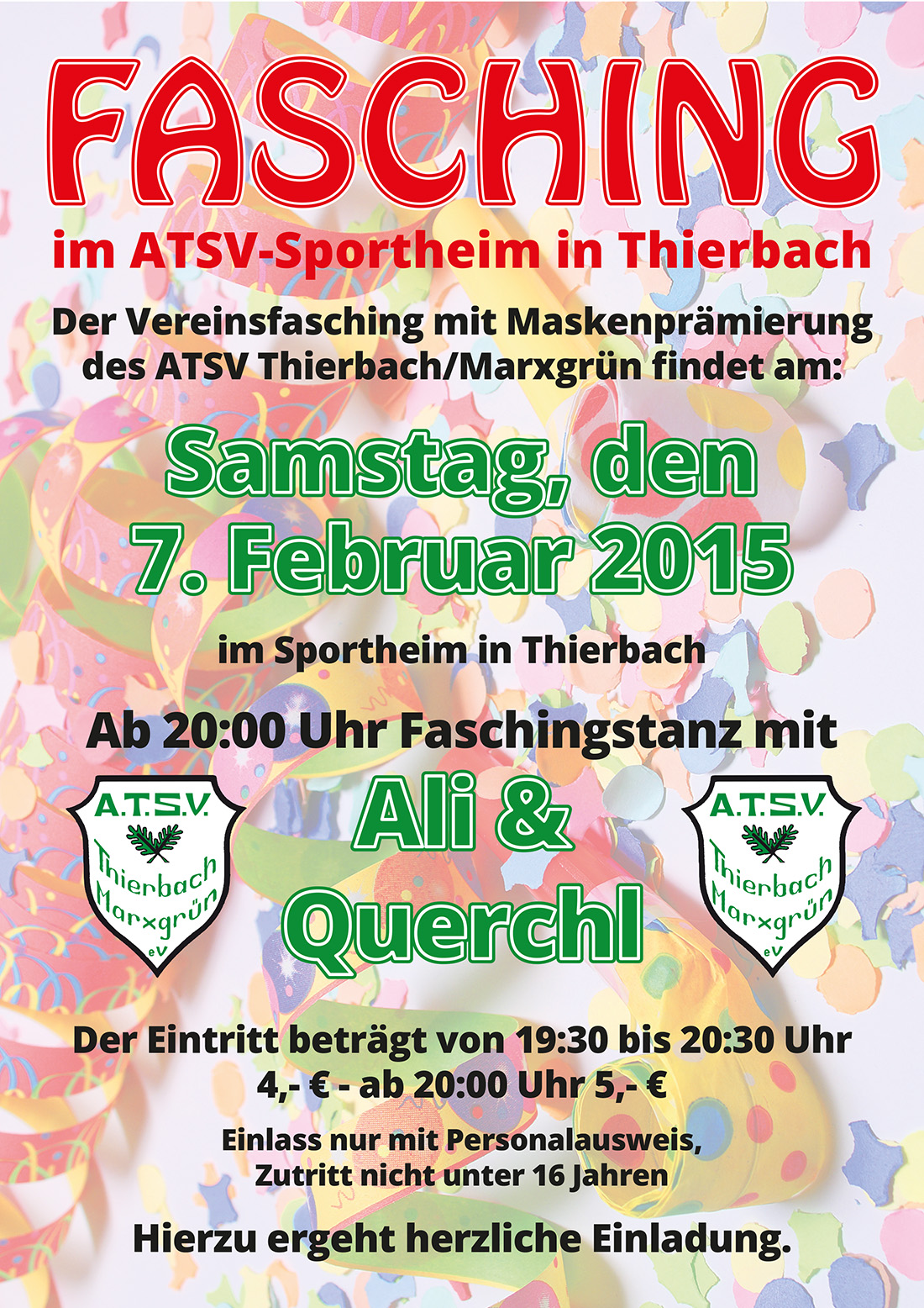 Auch in diesem Jahr lädt wieder der ATSV Thierbach / Marxgrün zu seinem traditionellen Faschingstanz in den Sportheim nach Thierbach ein.