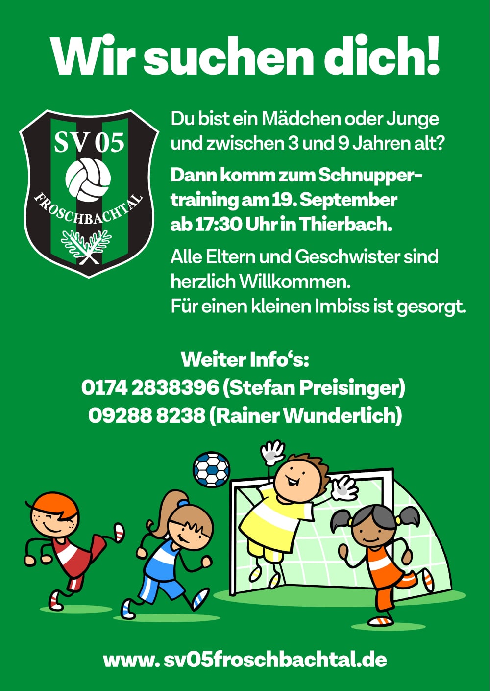Du bist ein Mädchen oder Junge und zwischen 3 und 9 Jahren alt? Dann komm zum Schnuppertrainig am 19. September ab 17:30 Uhr in Thierbach.