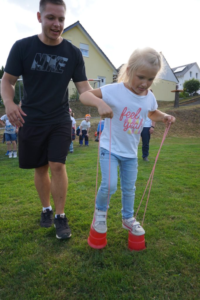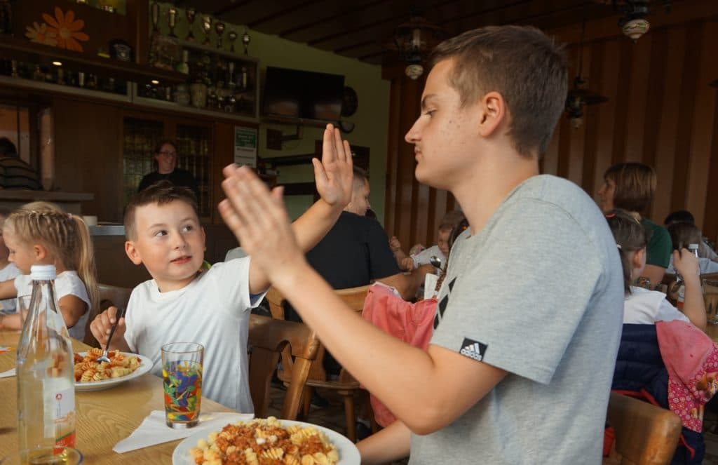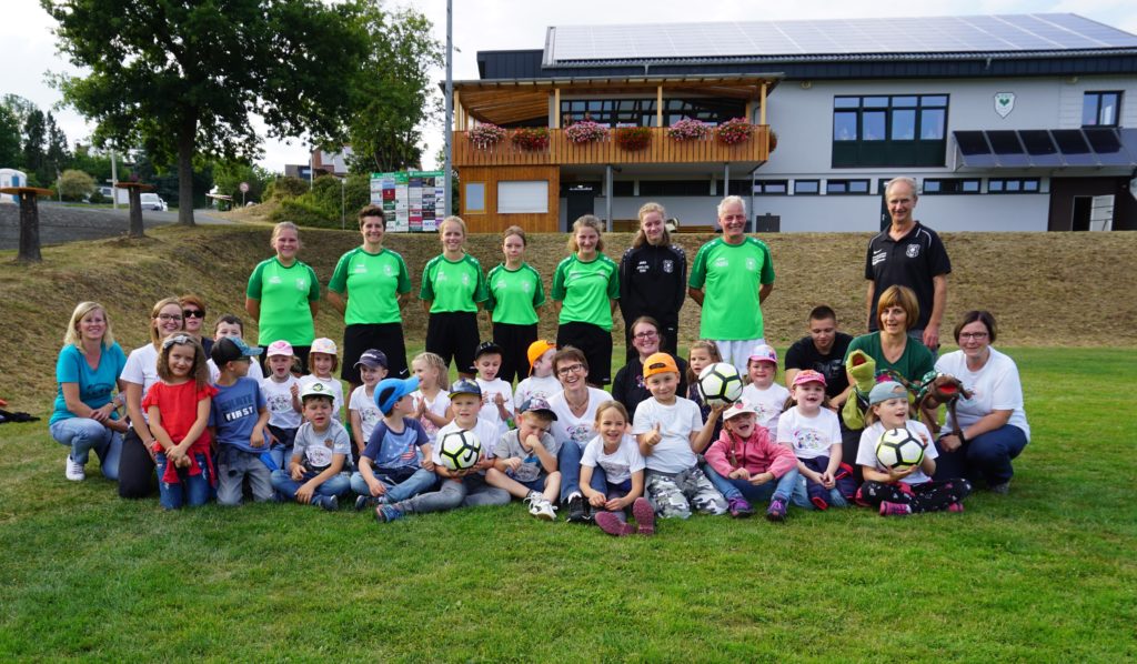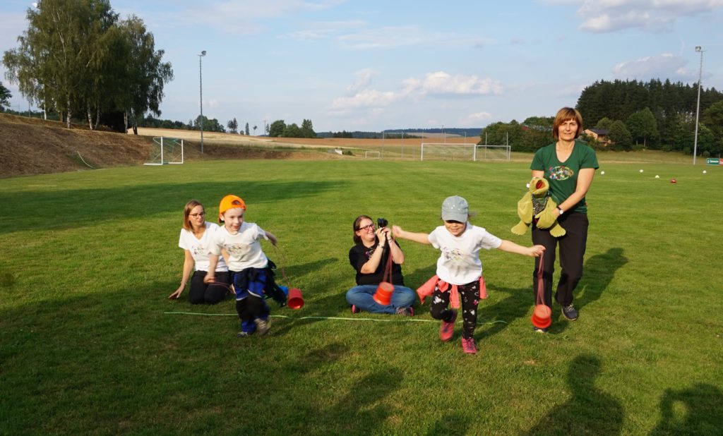 Ein reichhaltiges Abendessen servierte ein Team der SV05 Froschbachtal, der munteren Wandergruppe, die beim Übernachtungsfest des Kindergartens zwischen Bobengrün und Bad Steben unterwegs war. In einer spektakulären Rettungsaktion hatten sie einen waghalsigen Ameiserich und seine Schildkrötenfreundin aus dem Froschbach gerettet. Und so kamen die Nudeln mit leckerer Tomaten- oder Bolognese-Soße genau zum richtigen Zeitpunkt, denn nach der Aufregung hatten die Mägen bereits zu knurren begonnen. Im Thierbacher Sportheim ließen es sich die Jungen und Mädchen schmecken. Die freundliche Crew, angeführt von Patrick Mildner, kümmerte sich aber nicht nur um gefüllte Teller und Nachschlag für alle hungrigen Mäuler, sondern stellte im Anschluss auch den Fußballplatz für allerlei sportliche Aktionen zur Verfügung. Mit Laufdollis, Fußbällen und beim Räderschlagen verging die Zeit wie im Flug. Am Ende war noch Zeit für ein Foto mit den B-Juniorinnen. Ein herzliches Dankeschön gilt den Thierbacher Sportlern für die freundliche Aufnahme!