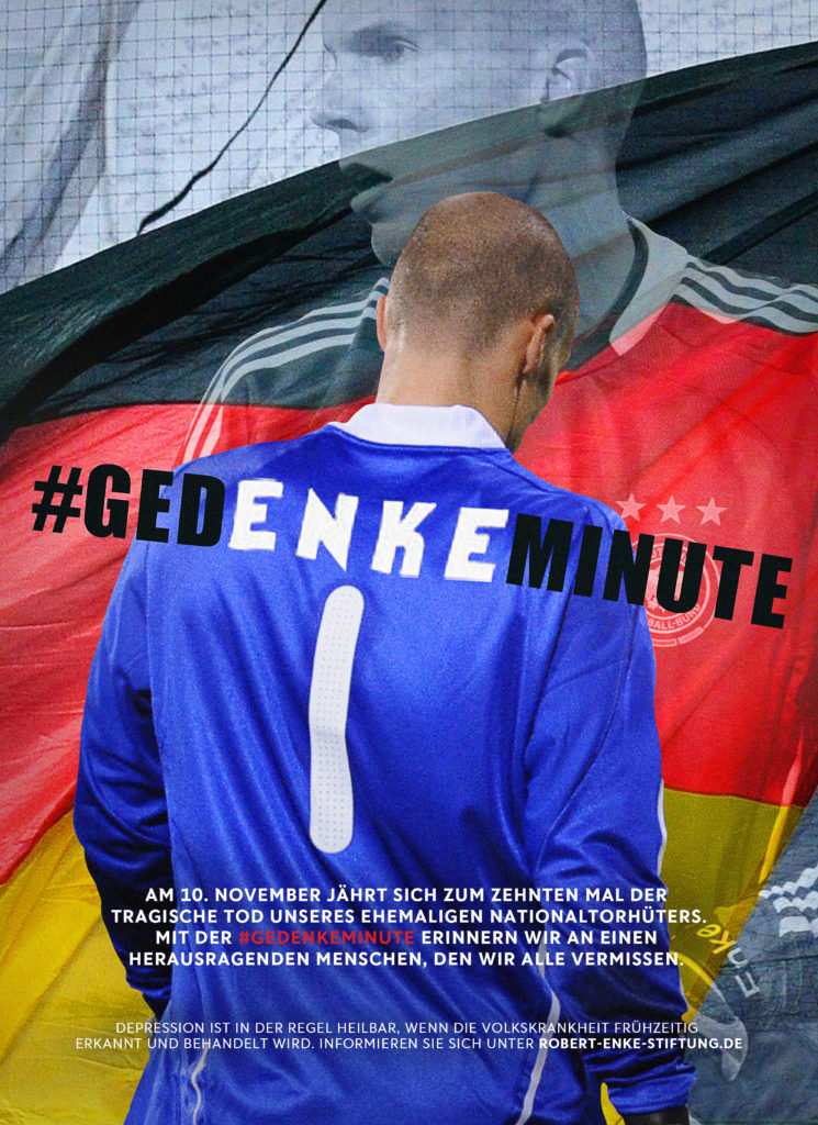 „Heute vor 10 Jahren nahm sich unser Nationaltorwart Robert Enke aufgrund von Depression das Leben. Mit der #gedENKEminute erinnern wir an einen herausragenden Sportler und Menschen. So wie Robert sind allein in Deutschland 4 Mio. Menschen an Depression erkrankt.