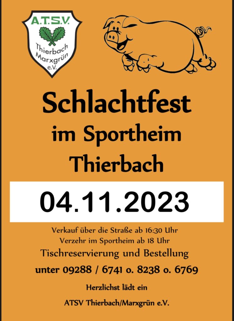 Der ATSV möchte auf das kommende Schlachtfest am 04.11.2023 hinweisen, Verkauf über die Straße ab 16.30 Uhr, ab 18.00 Uhr im Sportheim.