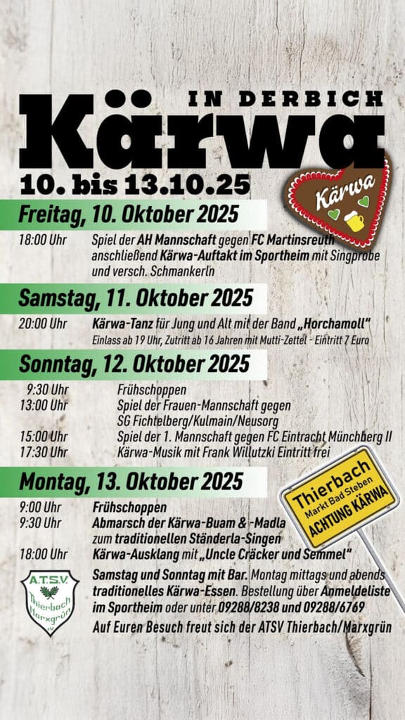 Die Thierbacher Kärwa steht vor der Tür – und der ATSV Thierbach/Marxgrün lädt euch herzlich ein, dabei zu sein! Vier Tage lang wird in der Bich gefeiert, getanzt, gesungen und natürlich Fußball gespielt. Für Musik, Stimmung, Schmankerl und beste Kärwa-Tradition ist gesorgt!